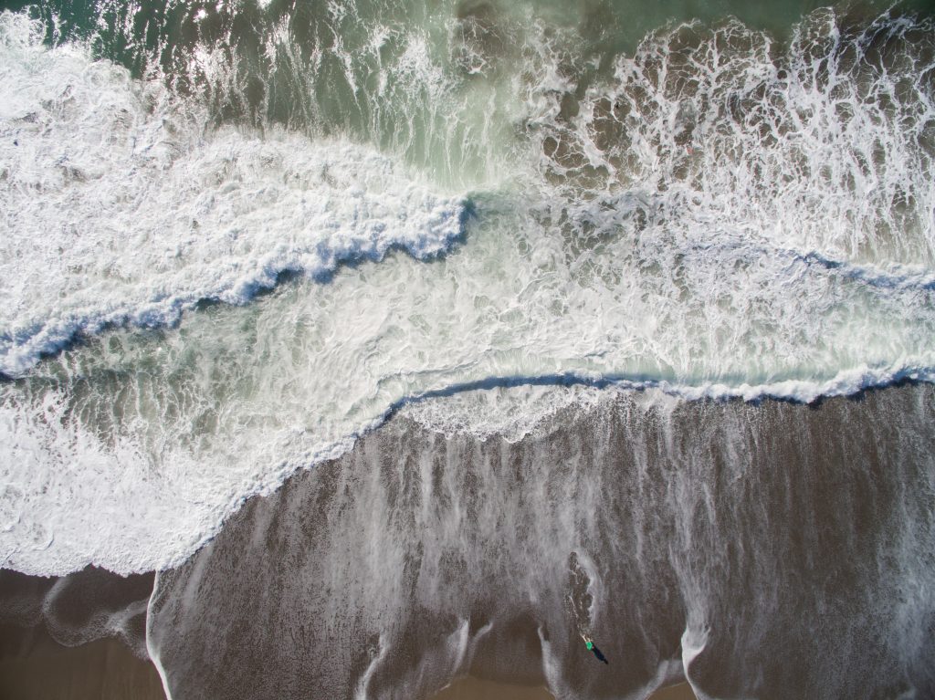 台風が過ぎ去った日本海、まだ海は大荒れで大きな波が打ち寄せては砕け、 その瞬間瞬間に美しい波模様が砂浜に広がります。 秋田県三種町、釜谷浜