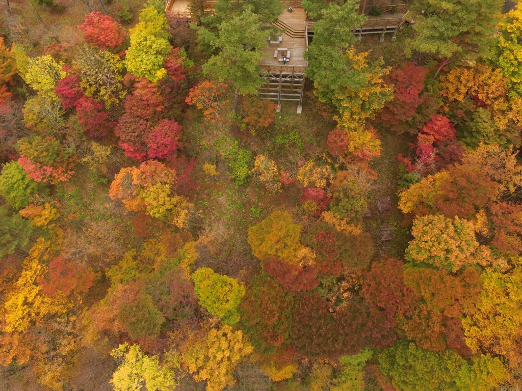 秋、紅葉の石倉山。管理棟のテラス周辺の木々の彩りが素晴らしくて目を奪われました。 秋田県三種町石倉山