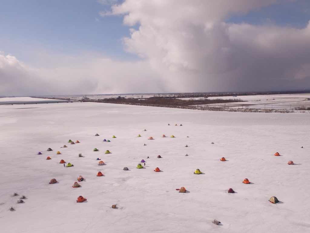 八郎湖、氷上のワカサギ釣りのテントが鮮やかに。 秋田県三種町。
