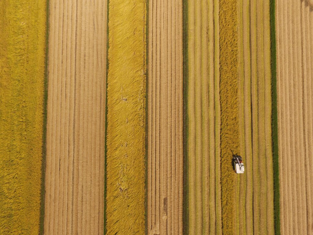 稲刈りが進む田園地帯。稲の黄色や稲刈り跡や大豆畑の茶色、美しいモザイク模様が広がっています。 秋田県三種町